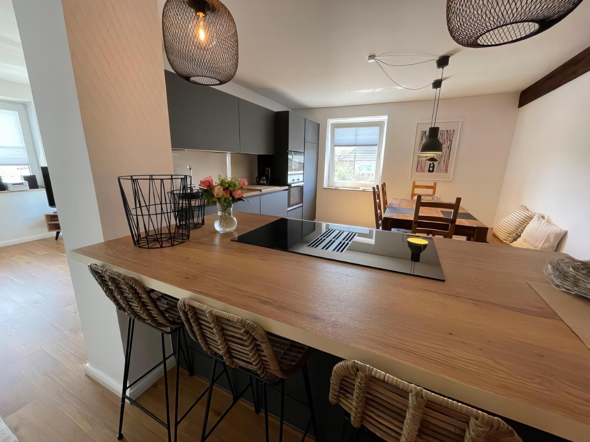 eingerichtet. Das Highlight ist die geräumige Einbauküche mit Kochtresen und